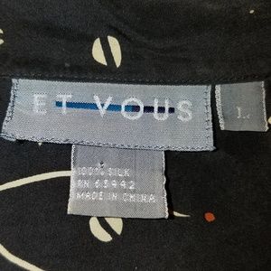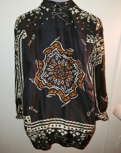 In brown and cream graphic print with a bit of orange, this wonderful silk blouse has off-set button front, long sleeves and button cuffs. Darts in shoulder yoke lend an easy fit across the back. Top button uses a loop closure instead of a buttonhole. Lively, lightweight 100% silk. Like new!