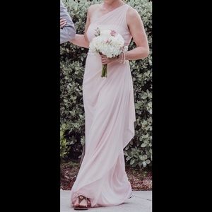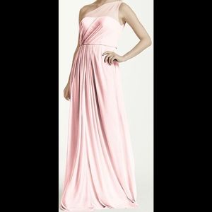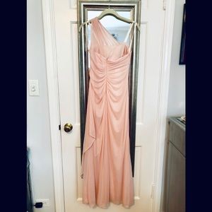 Petal pink bridesmaid dress perfect for any season! Davids Bridal Long Mesh One Shoulder Illusion Dress. Altered for 5’4” with 3” heel (pictured with flat sandal). Worn only once, condition like new!