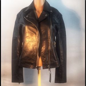 This is a brand new, NWT, beautiful leather biker jacket with shoulder detail, by Barney’s Originals. Super soft leather, original price is $405.