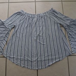 Time and Tru// Great condition! Relaxed swing fit through body, elasticized, ruffle sleeve, off-the-shoulder smocked neckline, lightweight, all-over striped pattern, top hits below waist, super cute!! Offers are highly encouraged!:)