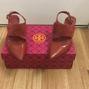 A burgundy /red 2inches flat hills with leather strap in front and very comfortable shoes ,a very stylish and classy shoes that you can wear all day in walking around the mall .