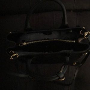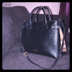 Medium to large black Banner bag by Burberry with House Check (tan multi) design on the sides but not on the inside. Black and gold accents and interior. 4” straps with lock and shoulder strap approximately 27” latches up or down - adjustable. Only used a few times. Clean. No rips. Few small scratches on the leather. Authentic. No bags, tags or box.