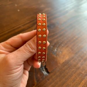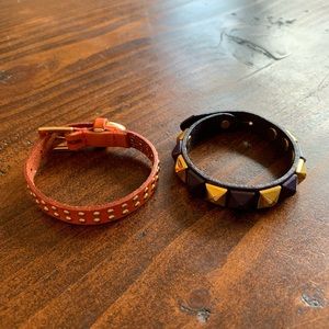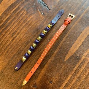 2 leather bracelets with gold stud accents. One is orange leather and the other is dark purple leather. In good used condition. Last pic shows a similar bracelet to show fit.
