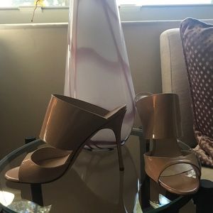 100% authentic Manolo Blahnik mules sold out in nude everywhere.I bought them from Saks last year, you can still see the tag on the bottom, they're in a great condition, only worn twice. There is a small scratch on right heel shown in the pictures. Heels are 4" high, with a lightly padded footbed and leather lining and sole.EUR size 37, fits US 6.5/ 7 Thank you for looking