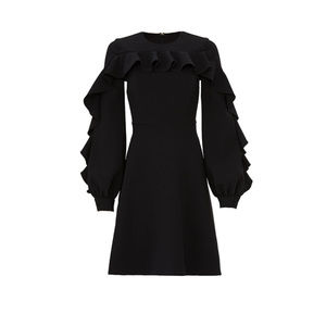 Absolutely beautiful designer dress! Black crepe (92% Polyester, 8% Polyuretha ne). Hourglass. Long sleeves. Crew neckline. Hidden back zipper with hook-and-eye closure. Fully lined. 37" from shoulder to hemline. Made in the USA.