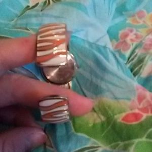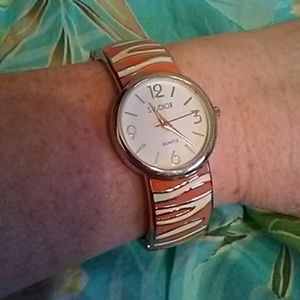 Orange and white tiger striped metal adjustable band. Worn once. Works but needs new battery.