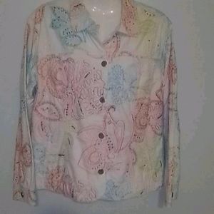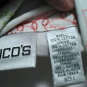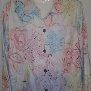 Like new!! jacket from Chico's.... Beautiful colors and embroidered patterns throughout the whole jacket button up the front with gold colored snaps.... Only worn a few times..