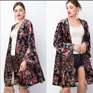 Floral velvet ruffle cardigan. This is lightweight, has a relaxed fit with stretch and wide sleeves. Truly gorgeous and on trend. (MODEL HEIGHT 5'11)