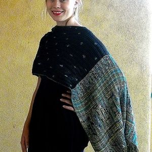 Price is firm. A gorgeous, reversible, and convertible wrap handmade in Santa Fe, New Mexico. This piece is screams artsy color and texture. Can be worn several different ways depending upon the look you want. Rich turquoise and black colors. You’ll never get bored with different ways to wear it, and it catches every eye in the room you. Made of stretchy soft rayon blend.