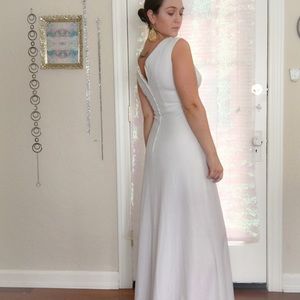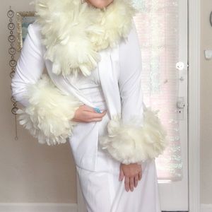 1950’s Hollywood Glam at its very finest ✨ Insane vintage late 1950’s 3 piece set, features floor length A line gown fitted at the bust, blazer style jacket with off white feather cuffs and matching feather neck scarf / some minor conditional issues, a couple surface stains here and there on the dress and will most likely come out with a dry clean otherwise this set is in great shape for its age! Best fit size S/4