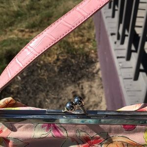 Pink, orange, green and yellow floral and fruit designed cloth purse with pink leather strap and pink leather bottom. Absolutely no damage to the outside of the purse. There are a few specks of discoloration inside that may come out. I have not tried. This purse is an antique. It has no brand name. It is approximately 50 years old but was wrapped and preserved well to keep it in A-1 condition. I bought it from an estate sale and it was the grandmothers. Used twice myself. Beautiful!