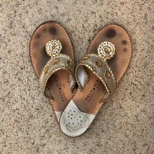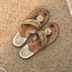 These are palm beach sandals, which are exactly the same as Jack Rogers because they’re made in an old jack roger factory! I wore them for only a few years so they’re still in very good condition (they darken easily). The soles are not plastic!