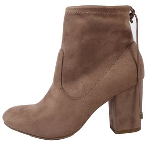 Cement faux suede round toe ankle boot with cute elastic ankle back tie, pull on style, and heel approx. 3 1/4". Model is a size 7, and a size 7 fits her perfectly.