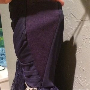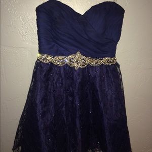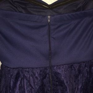 Size 5, altered. Navy blue, sparkly, short homecoming dress. Love this dress, but sadly it doesn't fit anymore. The alteration is to make the chest part a bit larger. The color of the additional piece isn't as bold as it appears in the picture. It's a navy blue as well. Feel free to make offers!!