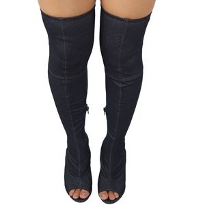 Blue denim over the knee boot with back tie and heel approx. 4 1/2". Shaft height including heel approx 26" , opening circumference approx. 14", calf circumference approx. 13". ( This is a size 7 measurement). This boot is best fit for slim legs. Model is a size 7, she is modeling a size 7.5. She would order half size bigger .