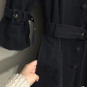 Cute Navy belted trench coat with a fun pattern on inside lining. 100% cotton.