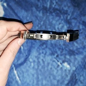 This bracelet is made out of a flexible rubbery, vegan leather. The smooth face, sliding accents, and clasp are silver colored stainless steel. The bracelet has a deployment clasp that unfolds into thirds to allow it to fit over the hand. The 2 stainless parts in the back are pulled to snap open and the clasp unfolds. Then after its on the wrist, it folds over and the 2 parts are then snapped into place to hold securely. One size fits most up to 7 1/2" around, approx width 1/2".
