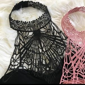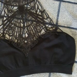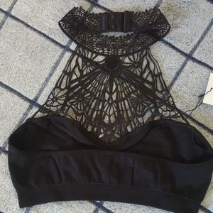Super sexy bralette available in black and rose. Features gorgeous detailed print & high neckline style. Double hook closure around neck. Band has nice stretch to it. Can fit and XS-M. Message me if you have any questions and check out my other listings. Bundles and offers accepted