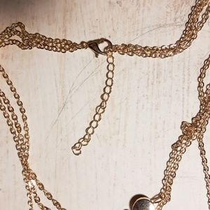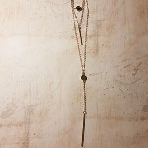 A beautiful layered, one piece necklace for all occasions. The three layers are secured with lobster clasp. The top chain has smooth circle pendant. The 2nd layer has a straight bar pendant & the 3rd chain has both the petite circle and delicate bar drop. Approximately 16" with 2" extender at top layer. Gold tone alloy. Comes in gift box.
