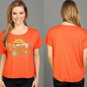 Orange "Sunny SideUp" t-shirt. Subline "DON'T WORRY BE HAPPY". Soft fabric, loose fit with 3-panel back with short sleeves.