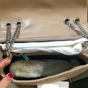 Brand new, never been used. The bag is a dark beige color with silver tone hardware. protective sticker still attached.