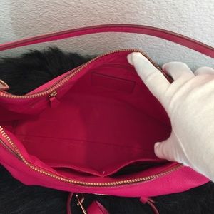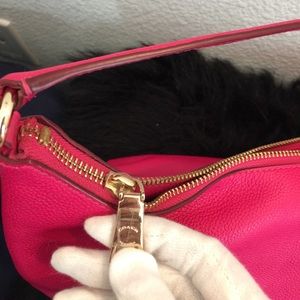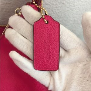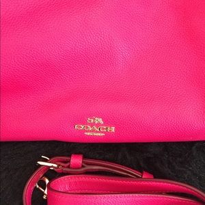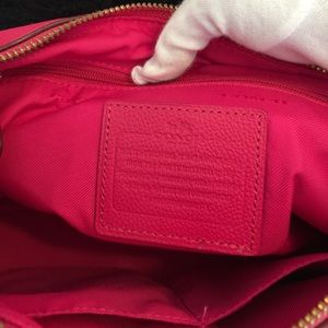 Cute pink coach purse. Have stripe and also can wear as a shoulder bag. Only used two times. Clean inside and out. Only two flaws is on corners