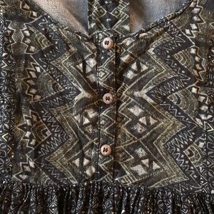 100% rayon. So flowy and gorgeous. Has wood buttons and back cutouts. This dress will look so great with a slouchy cardigan and some ankle boots this fall and winter! Total boho meets 90s grunge, so rad