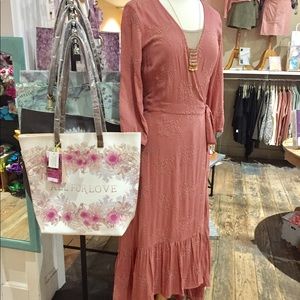 Stunning, three quarter sleeve, embroidered eyelet wrap maxi dress in a beautiful dusty rose, features a side tie closure and cascading ruffle hem. Gorgeous, flattering silhouette!