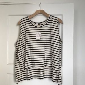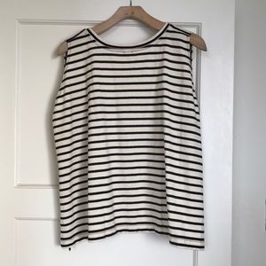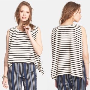 We the Free from Free People Striped muscle tank with breezy side slits and boxy, oversized cut. Hi - lo hemline. Black / white stripes. Size Small, fits oversized and boxy, could fit S-L. 100% Cotton. Chest: 25.5” - CF: 17.5” - Length: 22”
