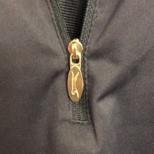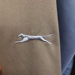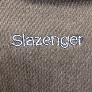 Very nice Men’s windbreaker in navy and medium blue. Water resistant and wind resistant. Slazenger is embroidered on the center back and the cat symbol is embroidered on the back left sleeve and well as being on the zipper pull. It has raglan sleeves.