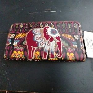 Multicolored (Mulberry One World) Hardbacked with Embroidered 🐘 & a Pocket on the Other Side, Inside there are 11 Card Holders with a Clear Holder for DL, a Zippered Pocket along with 3 other Pockets for $, etc.