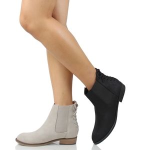 Black faux nubuck leather  chelsea elastic side back lace up tie with low heel approx. 1 inch. Model is a size 7 and a size 7 fits her perfectly .