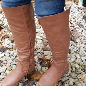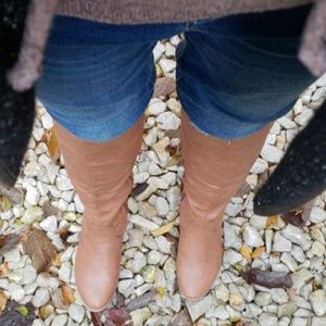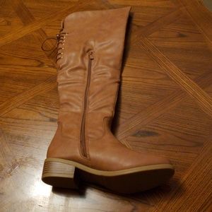 Tan over the knee boots with lace up back and modest heel. These adorable boots are made from a vegan leather and has a flat heel with a half zipper on the inner side of the boot. It hits the top of your knee! The elastic laces are a pretty detail and perfect for fall into winter.