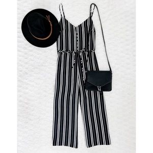 Trendy vertical striped jumpsuit in black & white, featuring v-neck, adjustable spaghetti straps, and black decorative buttons up the front. Zipper closure on the side and tie belt at the waist. Capri/cropped length wide pant legs.