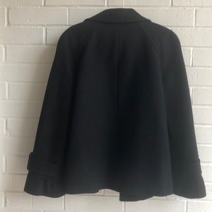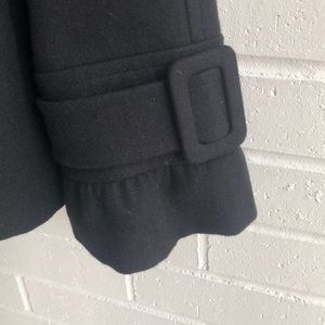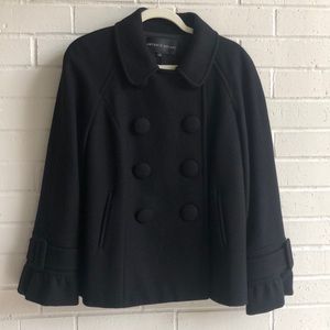 Antonio Melani wool blend Peacoat in black in perfect condition. 8 wool covered buttons in the front with two interior buttons. Two front pockets and ruffle detail on sleeves with buckles. Thick and warm!