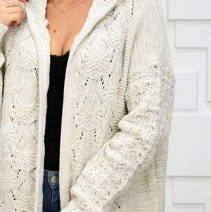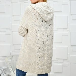This cardigan is so beautiful just look at that knit pattern, features in a classic creamy beige combo with goes with everything plus a fun hoodie detail!