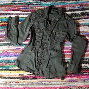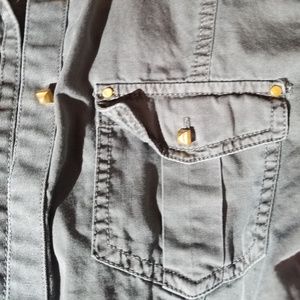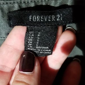 F21 Army Green Button-up💚 Gold studded buttons, missing 1 button in the middle as pictured. Size Small. Used only a few times. As always bundle and save on shipping!! ❄Happy Holidays❄