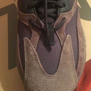 Low-top leather suede and technical mesh sneakers in tones of mauve purple taupe and grey. Reflective trims and underlays in silver-tone throughout. Round toe. Lace-up closure in grey. Padded tongue and collar. Signature tonal Boost midsole with yellow detailing at sides. Treaded rubber outsole in tan.