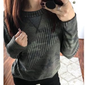 A ribbed camo top, featuring a round neckline, long sleeves and vented hem.