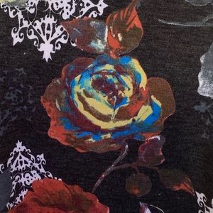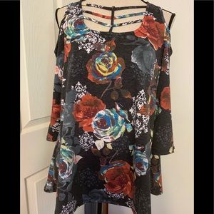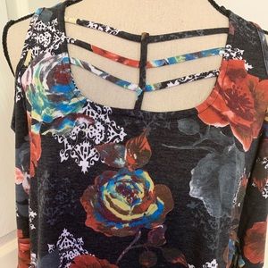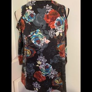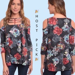 *Super pretty charcoal cold shoulder floral top has so much detail with the fancy top front, 3/4 length sleeves & the bold colorful flowers throughout