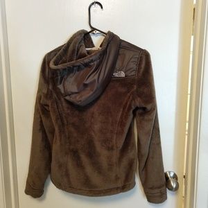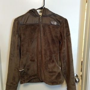 Dark brown soft midweight fleece jacket with hood and two zip hand pockets. Like new.
