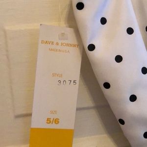 Perfect cocktail or homecoming dress! Black and white polka dot top piped in turquoise. Separated by a turquoise bow. Bottom is solid black with a little flair at the bottom!
