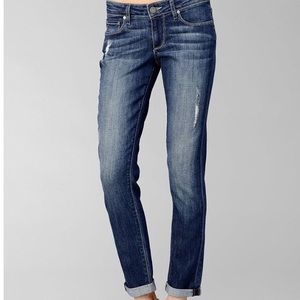 Paige’s popular, flattering boyfriend jeans in a “skinny” cut, (would recommend sizing down for a good fit) in the RARE Mandi wash with deconstruction.