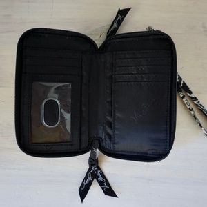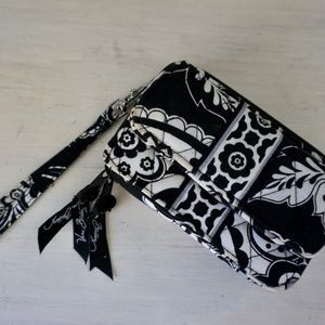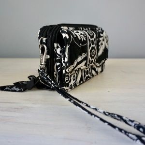Black and white Vera Bradley Wristlet. Magnetic pocket in front. Middle pocket with open-faced wallet including card slots. Back pocket with zippered coin pouch. Detachable wrist lanyard. Minimal staining on frontal pocket edges.