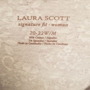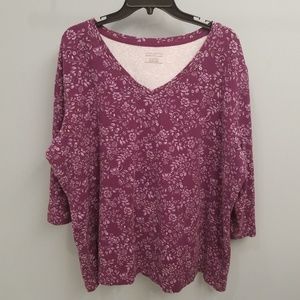Purple and white 3/4 length sleeve print top from Laura Scott in a size 20-22 women's. 95% cotton and 5% spandex. This top measures 28 inches from the top of the shoulder to the bottom and 26 inches from armpit to armpit. Preloved and in good condition. Reasonable offers welcome.