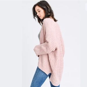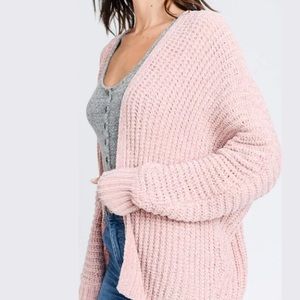 Featuring a slightly oversized soft textured chenille open front boho cardigan sweater. Long sleeves. Slightly shorter front length.