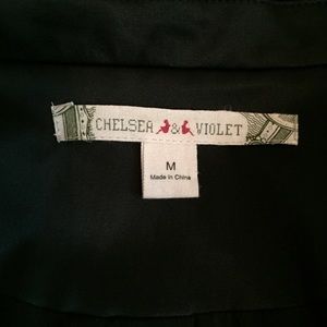 Chelsea & Violet black satin look blazer with sequin embellished arms . Size is medium . Excellent condition . Free of any damage . Single button front with double pockets . V- shaped cuff , v- shape back tail . Measures from underarm to underarm 19 inches . Length is 24 inches . Comes from a non smoking home .