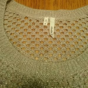 Light Purple with silver sparkle within, scoop neck, honey comb- like pattern that has a loose knit, fits well with form fitting long sleeve t-shirt. Excellent condition wore twice. From Maurices.