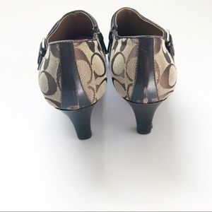 Ankle boots with heels and are a tan color. Classic coach monogram.