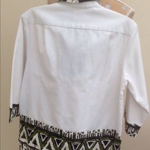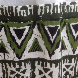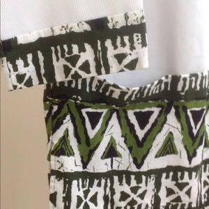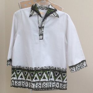 This vintage tribal tiki cotton pullover features Barkcloth collar, placket and two pockets. Side slits. Sleeve length is 17". Shoulder to hem is 27"